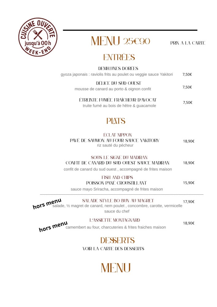 Plat : 15.9€ (veggie*) / 15.9€ à 19.9€ (viande ou poisson) /17.9€(burger)